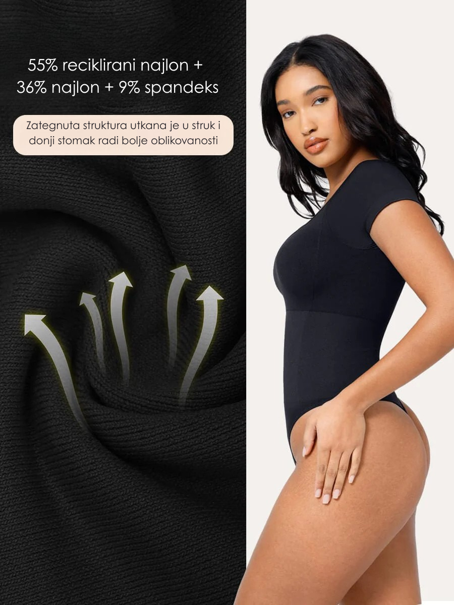 Ovaj elegantni bodi sa kvadratnim izrezom donosi savršenu kombinaciju sofisticiranog izgleda i svakodnevne udobnosti. Zahvaljujući visokokvalitetnim recikliranim materijalima i pažljivo osmišljenom kroju, idealan je za razne prilike – od casual outfita do večernjeg izlaska. Ističe liniju tijela, oblikuje figuru i pruža laganu potporu u predjelu stomaka.