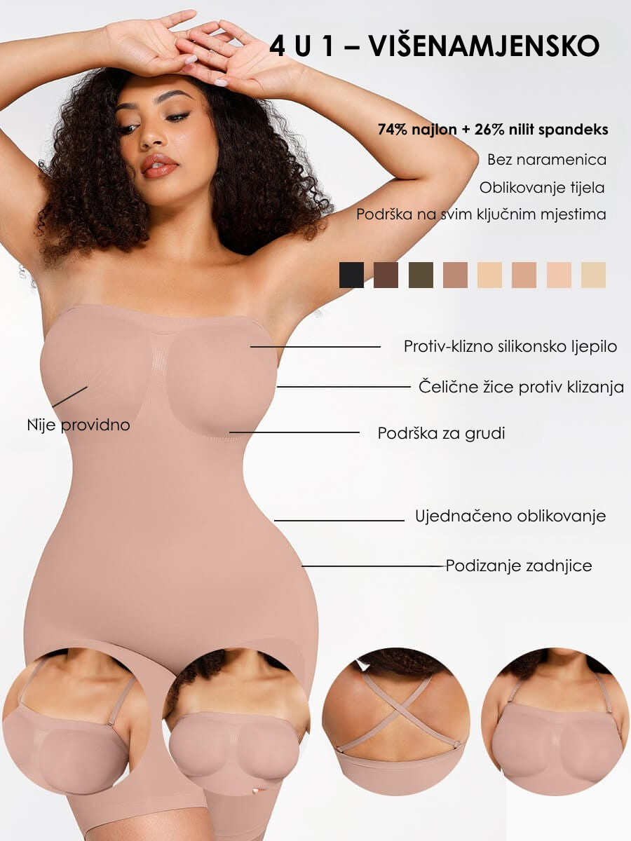 Otkrijte idealno oblikovanje i potpunu udobnost uz naš bodi bez bretela! Dizajniran da pruži potporu grudima, oblikuje struk i stomak, te podigne zadnjicu, dok ostaje neprimjetan ispod odjeće. Uz mogućnost nošenja na više načina i dodatne prozirne naramenice, ovaj bodi je savršen za sve prilike.