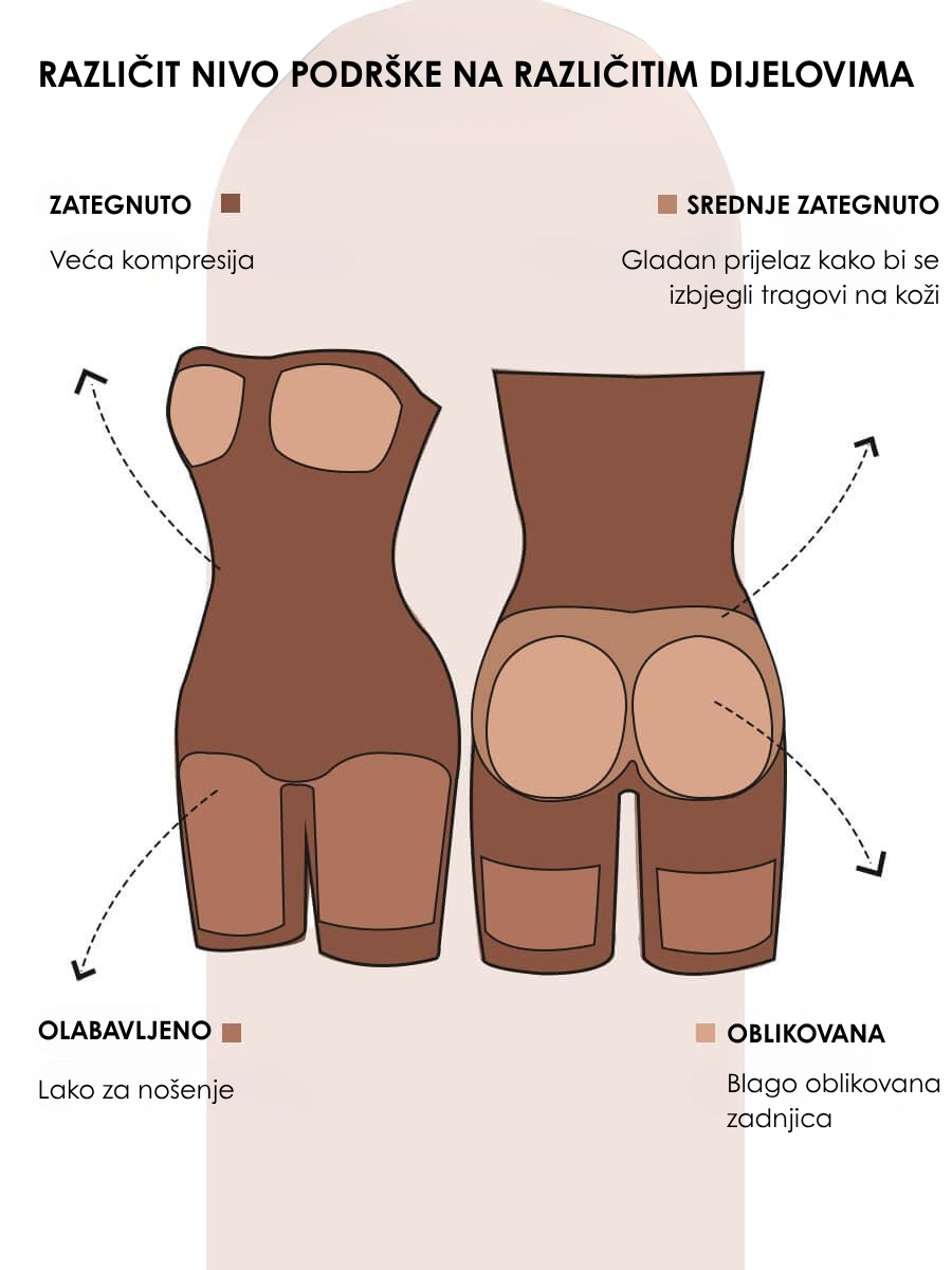 - Oblikovanje tijela: Zategnuta struktura u predjelu struka i stomaka dodatno oblikuje donji dio stomaka i čini siluetu glatkom.